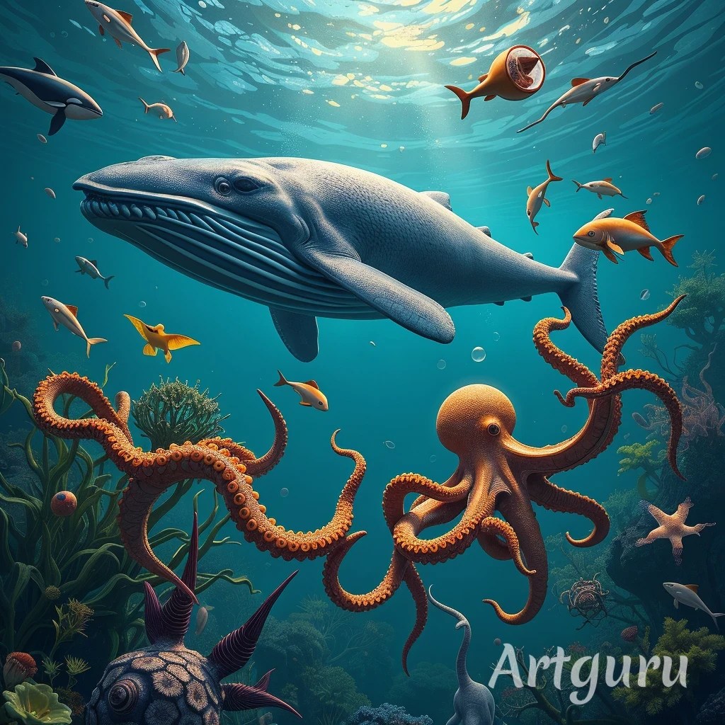 D’autres animaux marins, comme la pieuvre géante du Pacifique, la seiche, ou encore le nautilus, ont contribué à façonner les récits marins. Leur intelligence, leur camouflage spectaculaire grâce aux chromatophores, ou leur mode de propulsion à réaction nourrissent les descriptions anciennes de créatures étranges et méconnues.